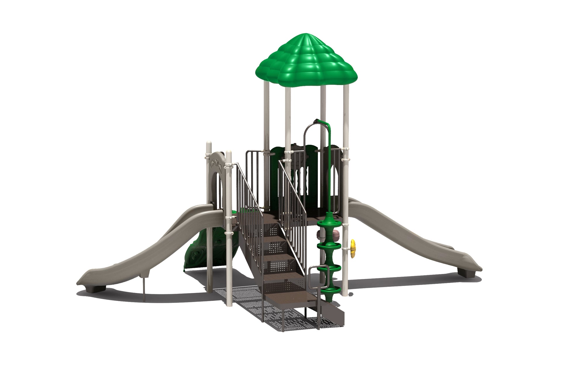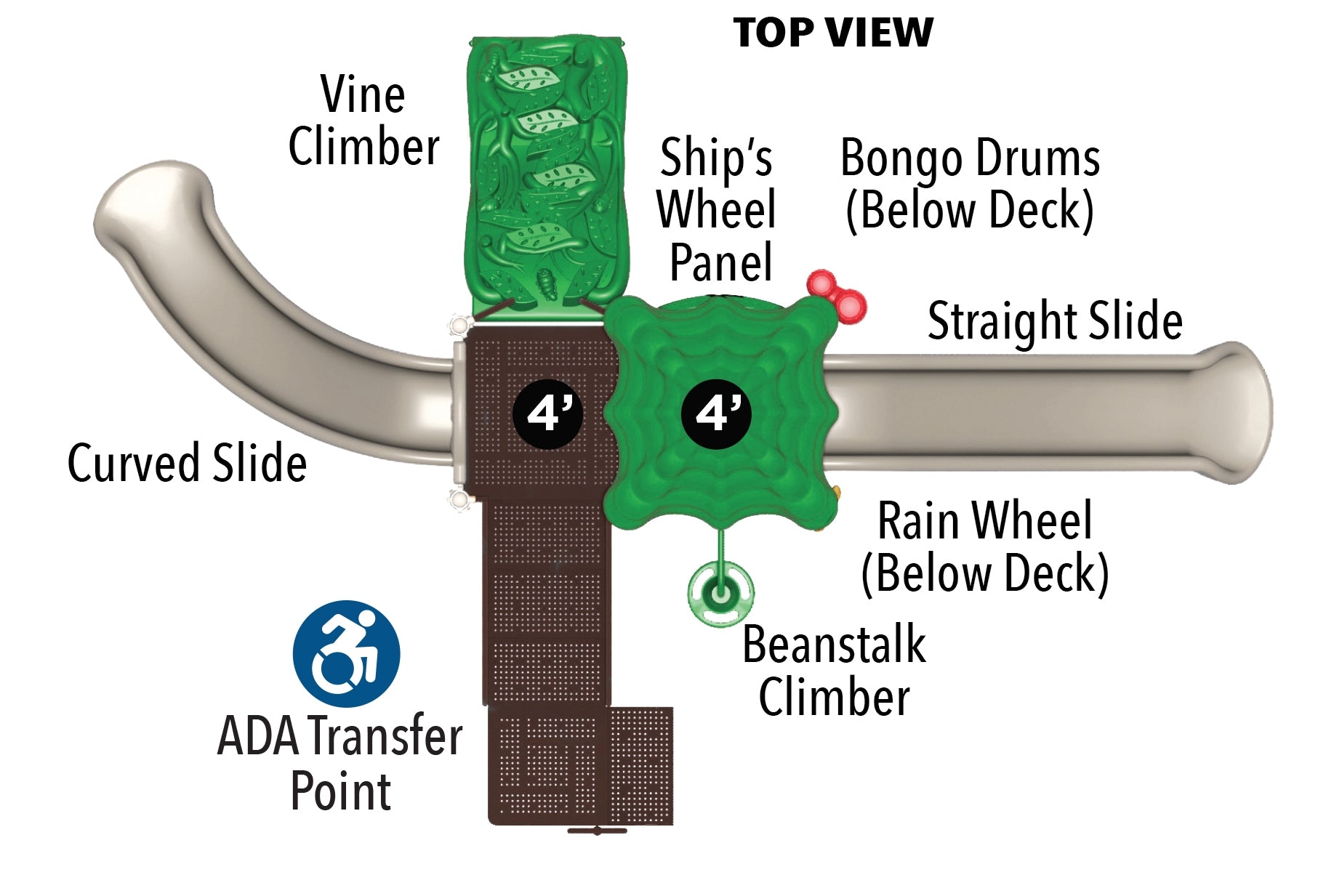 The Hawk's Nest boasts a challenging 4' Vine Climber and Beanstalk Climber, while also offering a Straight and Curved Slide. The Ship's Wheel Panel adds dramatic play opportunities while giving caregivers increased visibility to the structure. Two ground level music components ensure that children of all abilities will enjoy this structure. Finally, the roof helps keeps kids cool as they explore the Hawk's Nest. This structure meets ADA guidelines and is commercially compliant with ASTM & CSPC. The posts are 13-gauge galvanized steel tube and powdercoated. The plastics are heavy-duty rotomolded & blow molded components. Critical fall height is 4’0” A ground spike surface mount is included with the structure, but an anchor bolt surface mount or in-ground mounting kit can be purchased separately. Perfect for easy-install, commercially compliant and budget-conscious solutions for daycares, churches and apartment complexes!
