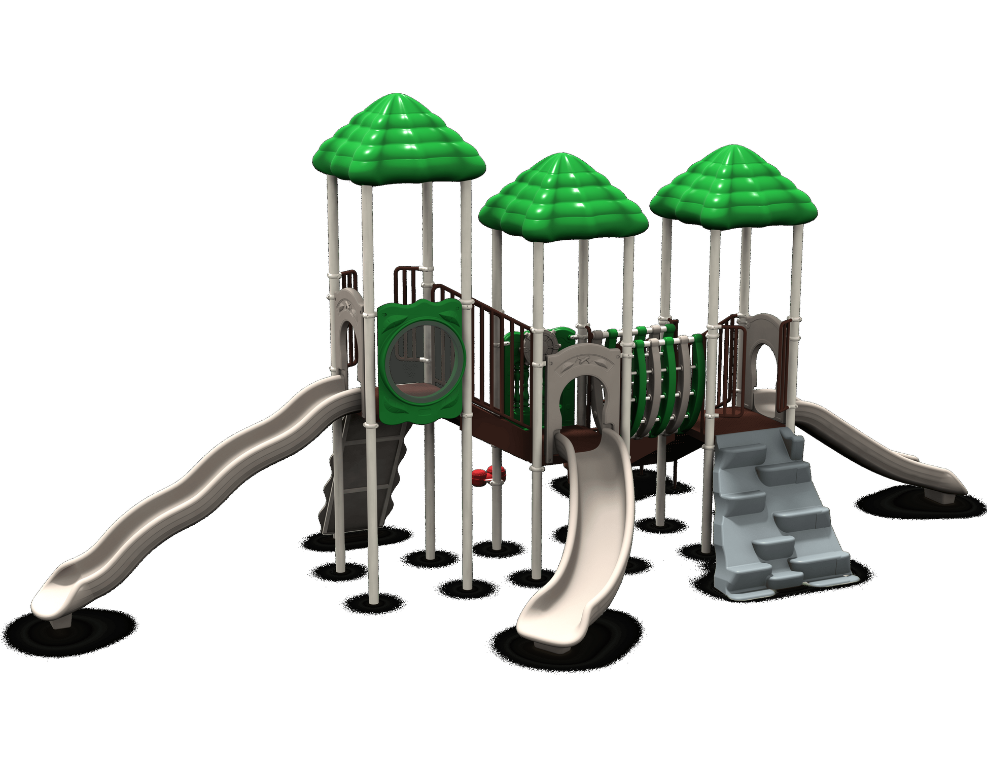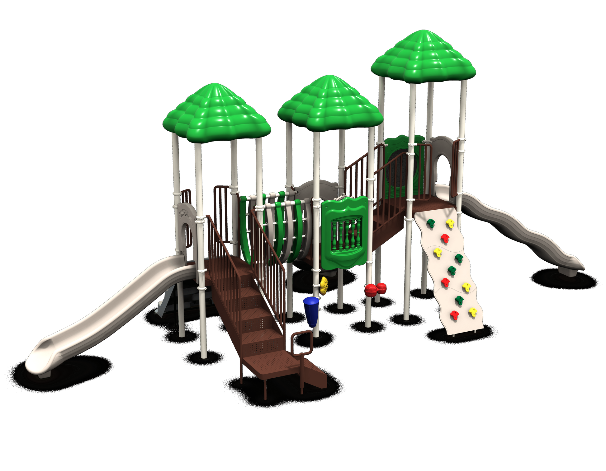 One of our most popular structures, Rainbow Lake offers a variety of play value for children ages 5-12. Children can ascend up the Vine Climber and traverse across the Bone Bridge before giving the Ships Wheel a spin and then zip down the exciting 6 Wave Slide. An alternate route includes scaling the Deluxe Rock Climb and sliding down the 4 Curved or Straight Slide. Ground level drums and rain wheel offer play experiences for children of all abilities.