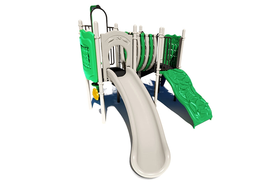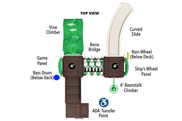Nothing but smiles on the Sunnyside! The Sunnyside is a challenging and inviting play structure packed with diverse play components for children ages 2-5 or 5-12. Children can develop their gross motor skills and balance as they travel up the 4’ Vine Climber and across the Bone Bridge. The Ships Wheel Panel allows children to activate their imaginations as they become ship captains who navigate and socialize with friends. The 4’ Curved Slide offers an exhilarating sensory experience as children exit the structure and two ground-level music components offer creative play for children of all abilities. The Sunnyside meets ADA guidelines and is commercially compliant with ASTM & CSPC. A ground spike mounting kit is included with the structure, but an anchor bolt surface mount or in-ground mounting kit can be purchased separately.