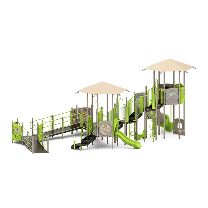 ADVENTURE ACRES is a vibrant, multi-level playground designed for children ages 5 to 12, combining high-energy physical play with engaging sensory and educational elements. Spanning a 60 by 40-foot use zone, this expansive structure rises to a fall height of 96 inches and offers a thrilling mix of towering slides, unique climbers, and interactive panels.