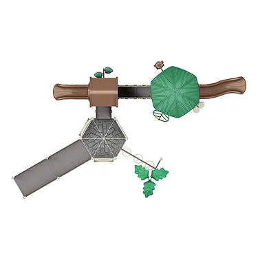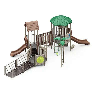 Key features include climbers like the 3ft Leaf Step Climber, 4ft Trunk Post Climber, and 4ft Leaf Climber, slides such as the 4ft Single Slide and 3ft Single Slide, and interactive panels including the Gears Panel, Maze Panel, and Four In A Row Panel. The Overhead Rotating Rings and Straight Bridge add dynamic physical challenges, while the ADA Ramp ensures accessibility for all children. Additional elements like the Entry Ladder, Saddle Seat, Bongo, and Palm Topper enhance the play experience.