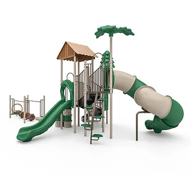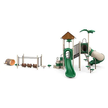 Children will be thrilled by the exhilarating 6ft Spiral Tube Slide and the classic 4ft Single Slide, offering varied sliding experiences that cater to different thrill levels. Accessibility is a key feature, with an ADA Transfer Station ensuring that children of all abilities can join in the fun. The Balance Stumps Bridge with a Single Handrail provides a unique balancing challenge, enhancing motor skills and balance.