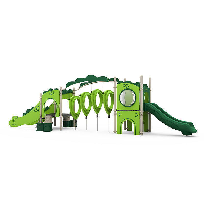 The BRONTO play structure is a fun and imaginative playground unit tailored for children ages 2 to 5, combining gentle physical challenges with engaging sensory elements in a compact, dinosaur-themed design.