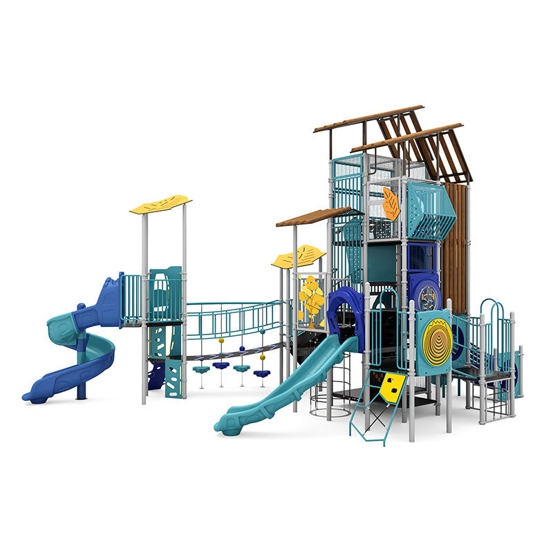 The TREETOP ESCAP is an impressive and thoughtfully crafted play structure designed to offer children ages 5 to 12 a thrilling, elevated adventure experience. With a commanding equipment size of 32 feet in length, 27 feet 2 inches in width, and soaring to a height of 22 feet 1 inch, this towering structure mimics the excitement of climbing through a forest canopy.