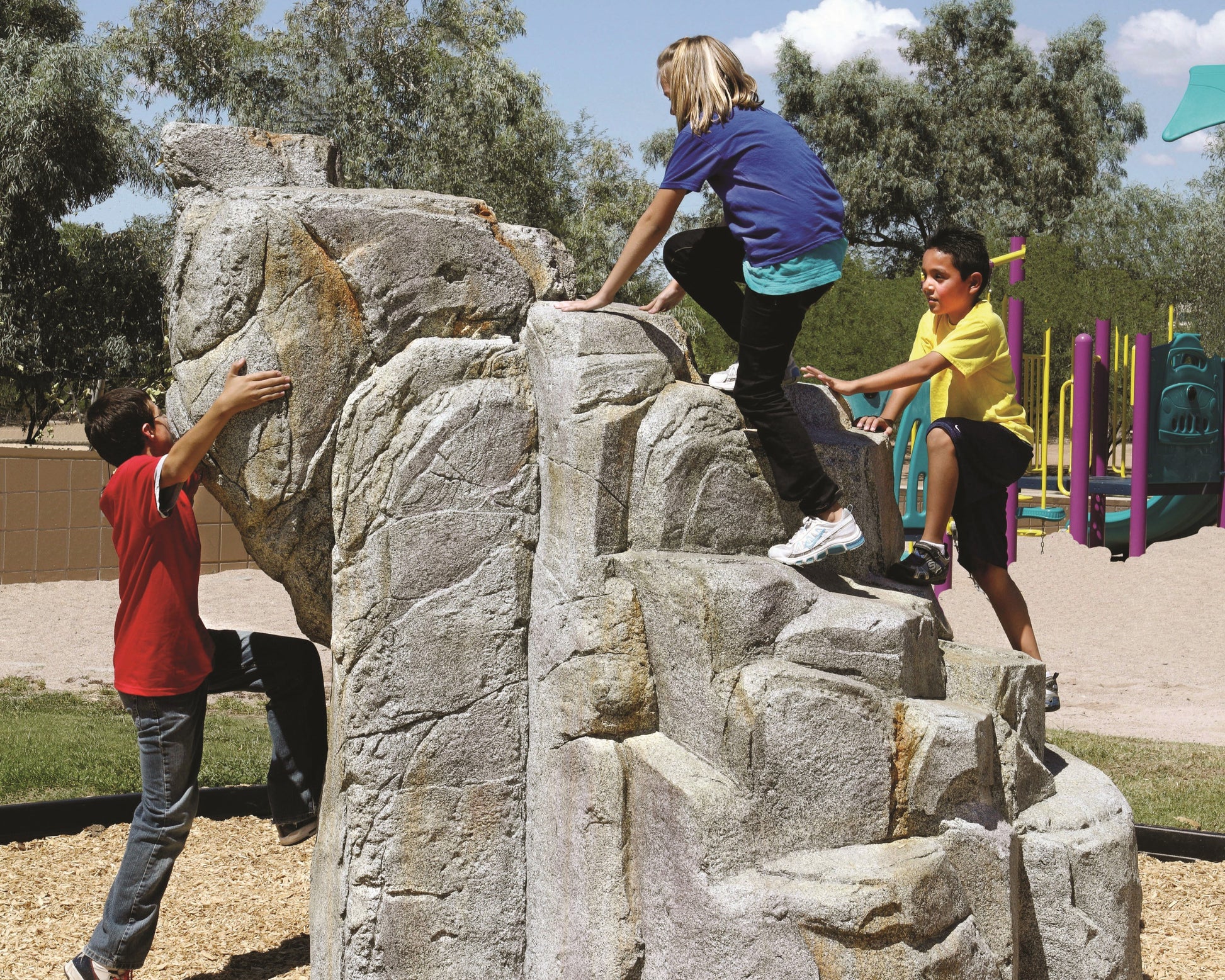 The medium granite boulder offers an exciting challenge for children ages 5-12 as they climb up the boulder to a height of 6 feet. The molded detail gives the boulder a truly organic feel that will complement naturalized play spaces. Consider combining large and medium playground boulders to create an arch to add even more rock climbing and active play opportunities. The NatureROCKS granite boulders are artfully designed from real rock outcroppings and hand painted to look and feel like granite. Each playground boulder is constructed of durable, weatherproof glass fiber reinforced concrete (GFRC). All boulders also feature built-in forklift channels to easily facilitate delivery and placement.